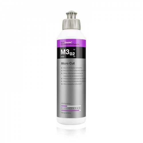 Koch Chemie Pasta Polish Finish Micro Cat M3.02, 1litru este parte din ultima generatie de micro-polish pentru indepartarea permanenta a urmelor nedorite de pe suprafata vopsita. Inclusiv holograme, zgarieturifine, sau urme de hartie abraziva de pana la p3000. Chiar si de pe vopseluri mai noi de tip scratch-resistant sau ceramice. Prin folosirea unor ingrediente extrem de specializate si unor abrazive fine extrem de omogene, un luciu impresionant si permanent, chiar si pe vopselurile negre. Hologramele si zgarieturile fine sunt eliminate mecanic si in nici un caz acoperite.